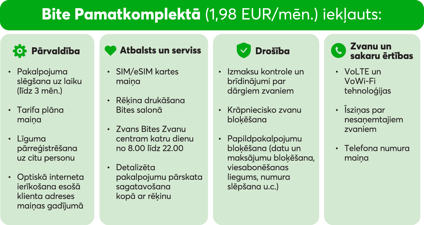 Bite Pamatkomplekts ir fiksēta ikmēneša apkalopšanas maksa, kas nodrošina, lai Bites elektronisko sakaru pakalpojumi ikdienā darbotos stabili, droši un ērti.